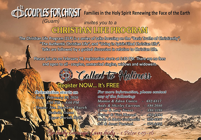 CFC Guam has been actively introducing the Christian Life Program (CLP) to various parishes and other areas in the northern and western part of Guam simultaneously. Praise God for the gift of a bountiful harvest from the CLP and for the amazing work of the Holy Spirit. With more empowerment from the Holy Spirit, and active participation and service of its members, it is believed that this is just a beginning of a stronger and bigger CFC family in the island.