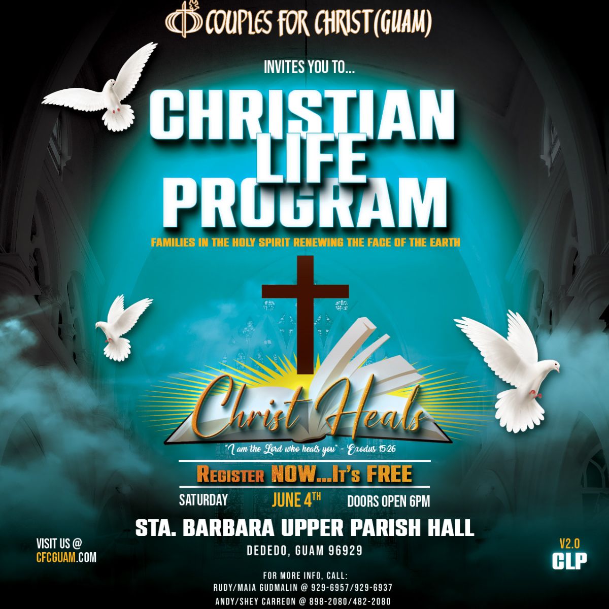 CFC-Guam cordially invites all couples, unmarried singles, widows and widowers, ages 20 and up to its upcoming CHRISTIAN LIFE PROGRAM (CLP) on Saturday 04 June 2022 @ 6:00PM at Sta Barbara Upper Parish Hall, Dededo, Guam.